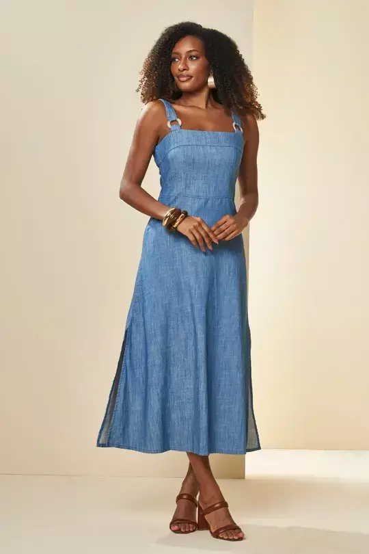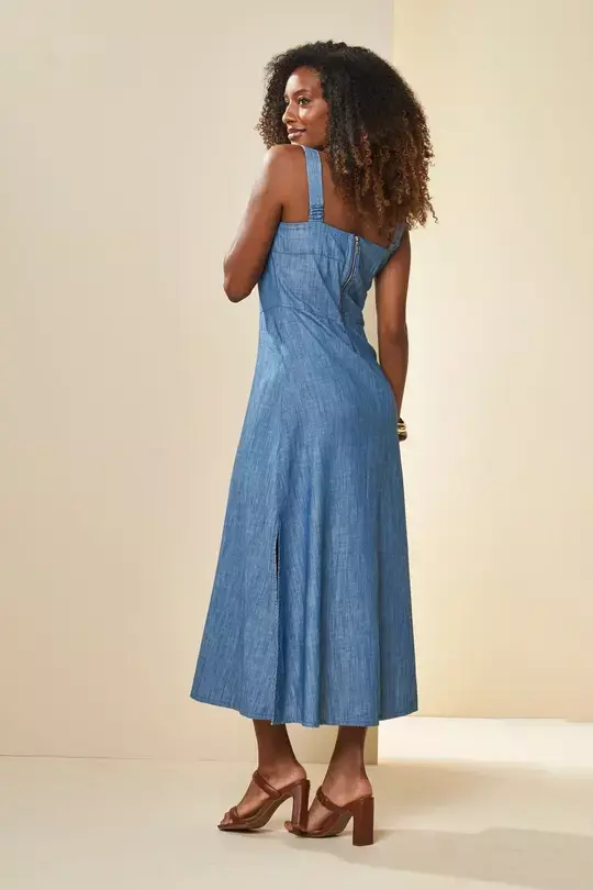 Um clássico moderno para compor looks versáteis e cheios de estilo. Confeccionado em jeans leve, esse vestido midi traz modelagem reta com caimento solto, proporcionando conforto e sofisticação ao mesmo tempo. O decote quadrado valoriza o colo enquanto as alças largas com detalhe em argola adicionam um charme extra. Nas costas conta com o fechamento em zíper invisível, garantindo praticidade e ajuste perfeito. Ideal para combinações casuais com sandália ou tênis e produções mais elegantes com salto e acessórios. 100% ALGODAO